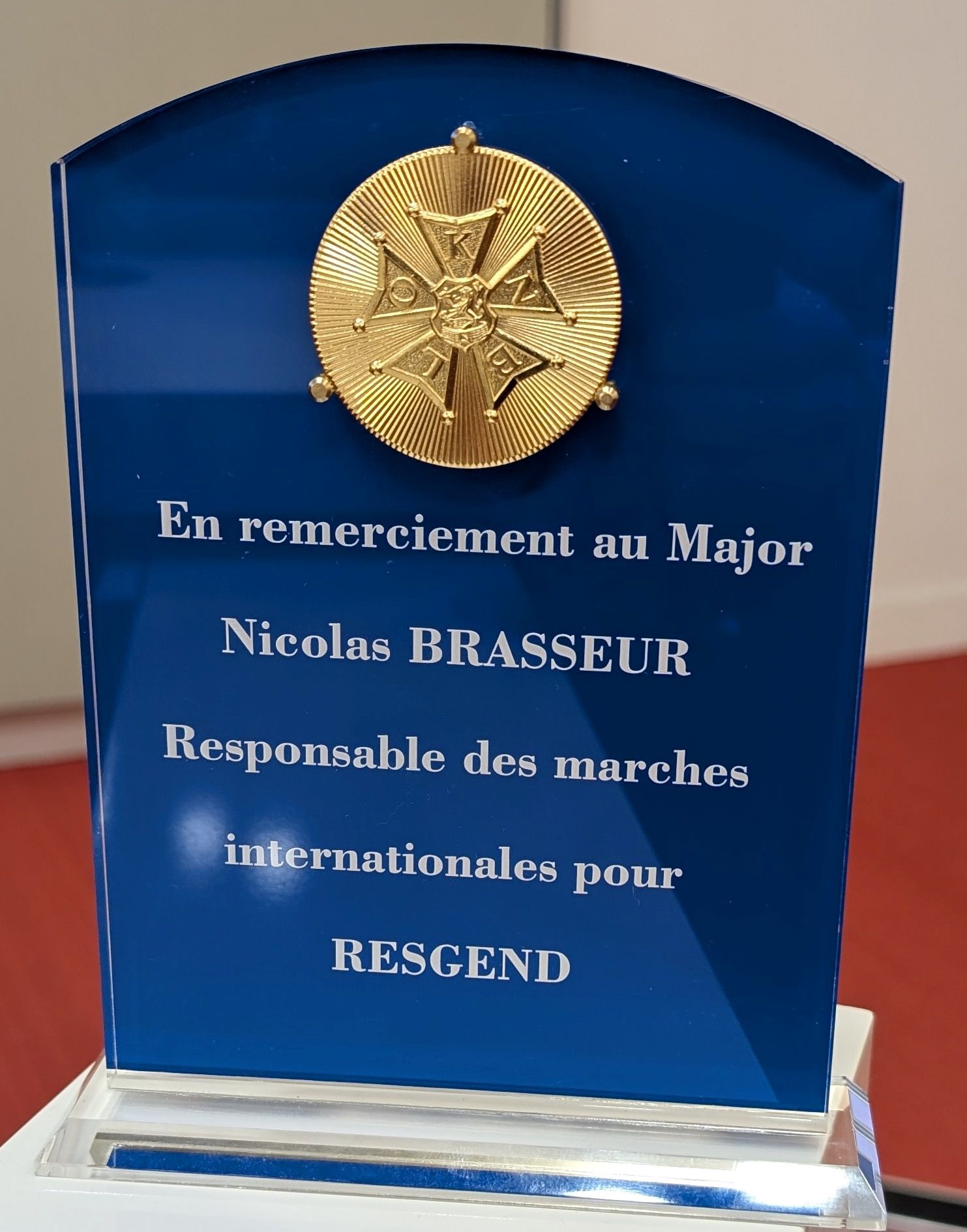 Un de nos camarades, le major (ro) BRASSEUR, a été justement récompensé, recevant du colonel (h) SOBOL, président d'honneur, un superbe objet matérialisant la reconnaissance de RESGEND.