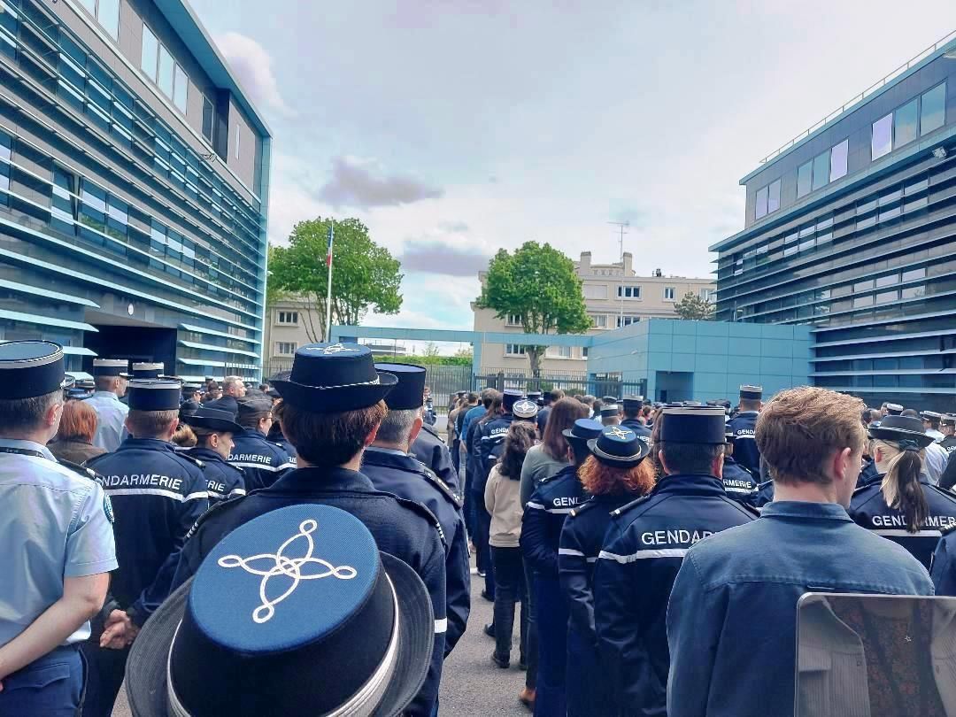 27/04/2023: Une cérémonie émouvante s'est tenue dans la cour "Arnaud Beltrame" de la D.G.G.N. (Direction générale de la gendarmerie nationale) pour honorer la mémoire du gendarme Loïc JEANSANETAS. Le général KIM a rappelé la vie militaire du défunt et énuméré ses récompenses et son avancement, hélas à titre posthume.